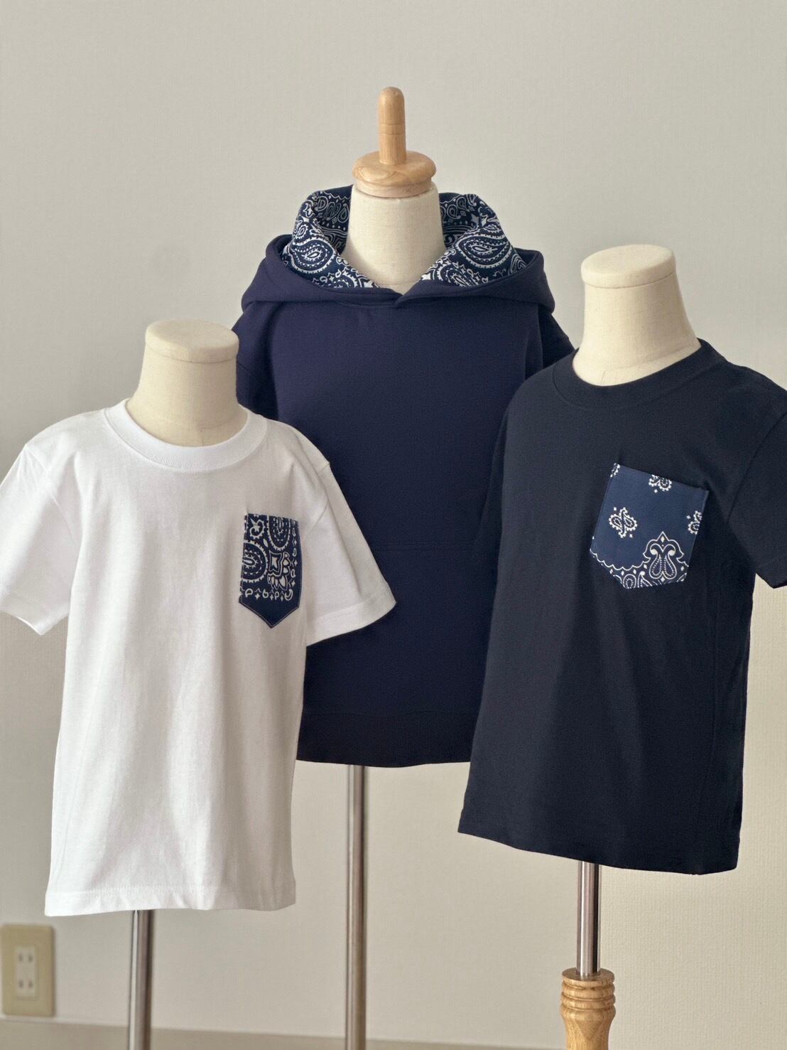 ベーシックなTシャツカットソーに、バンダナプリントのポケットがワンポイントでひとつひとつ丁寧に、縫い付けられております。